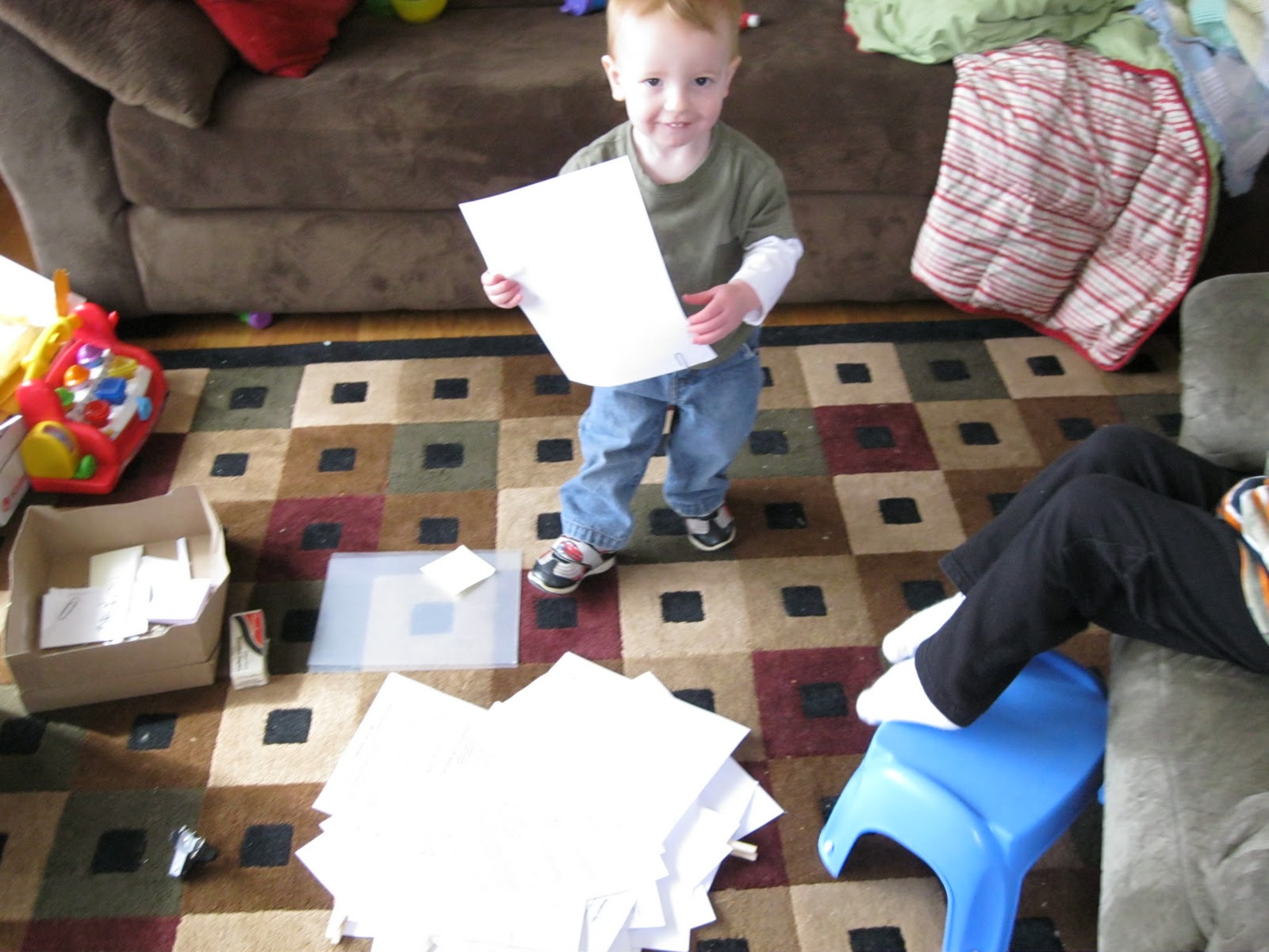 My absolute favorite though was when Clark decided to "send e-mail." Great reminder that what I do is open to copying by the boys. Clark took a stack of papers that after printing I realized I didn't need. To recycle I gave the stack to the boys to color on or fold.